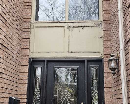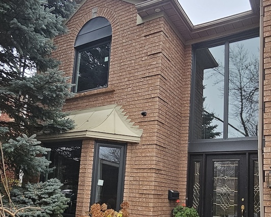 The homeowners in Oakville reached out to us for the replacement of their old, original wooden windows, which were rotting and leaking. They also wanted to change the house's appearance with different color windows and remove the outdated awning over the door.